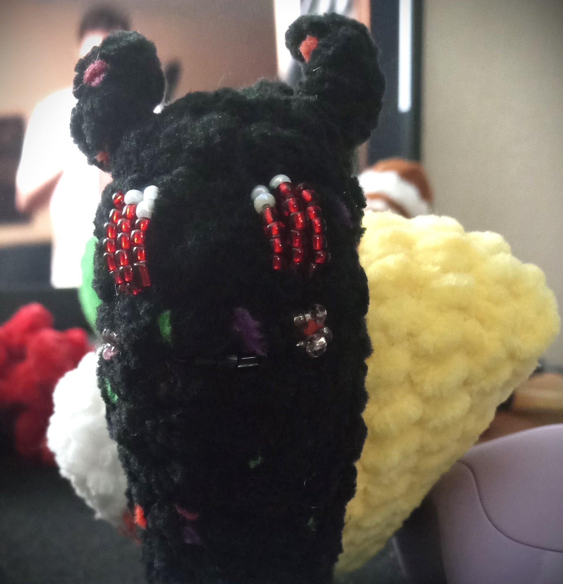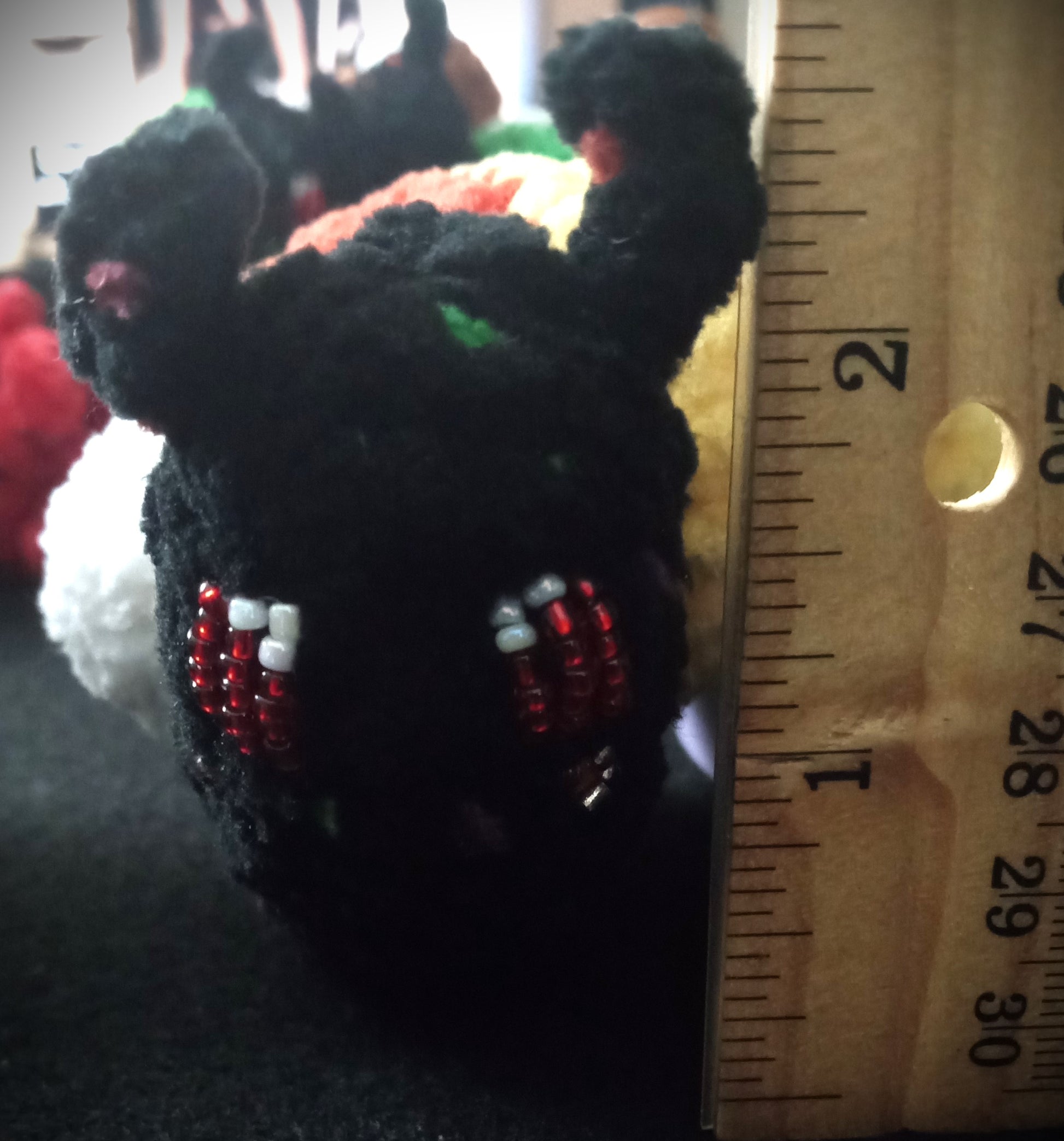 A palm sized snail familiar with a candy corn shell. Crocheted by me using the Candycornelius the Candy Corn Snail pattern by GardenHoeCrochet. They have a beaded face done by hand. The small beads make this unsuitable for small children and pets. 5+ years old. Adult supervision recommended.