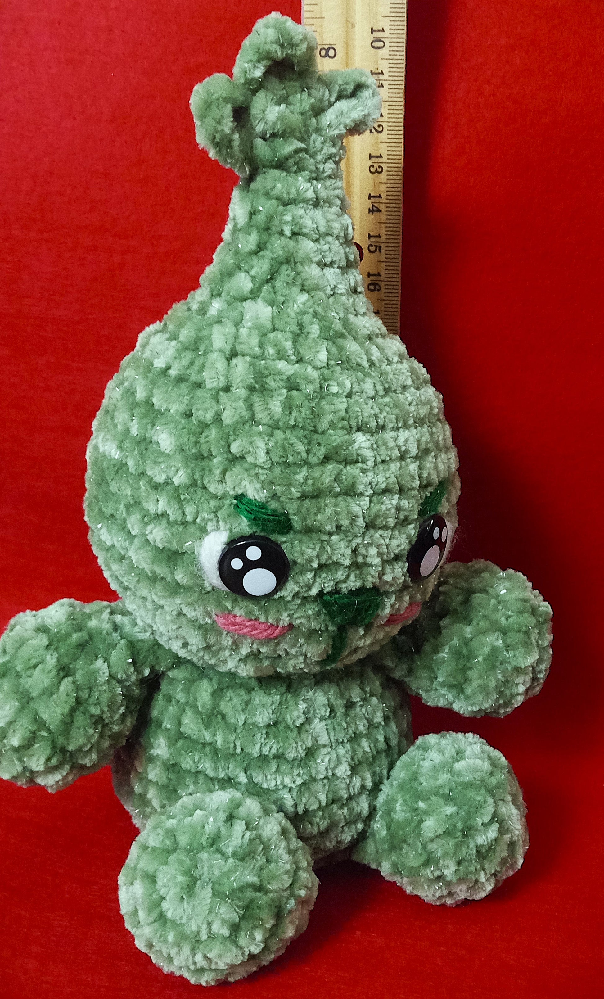 A small plush inspired by a baby-like Grinch! Crocheted by me and the pattern is Chubby Christmas Meanie by CrochetbyJanina. He does have plastic safety eyes so this is not suitable for young children or pets. 5+ years old and adult supervision recommended.