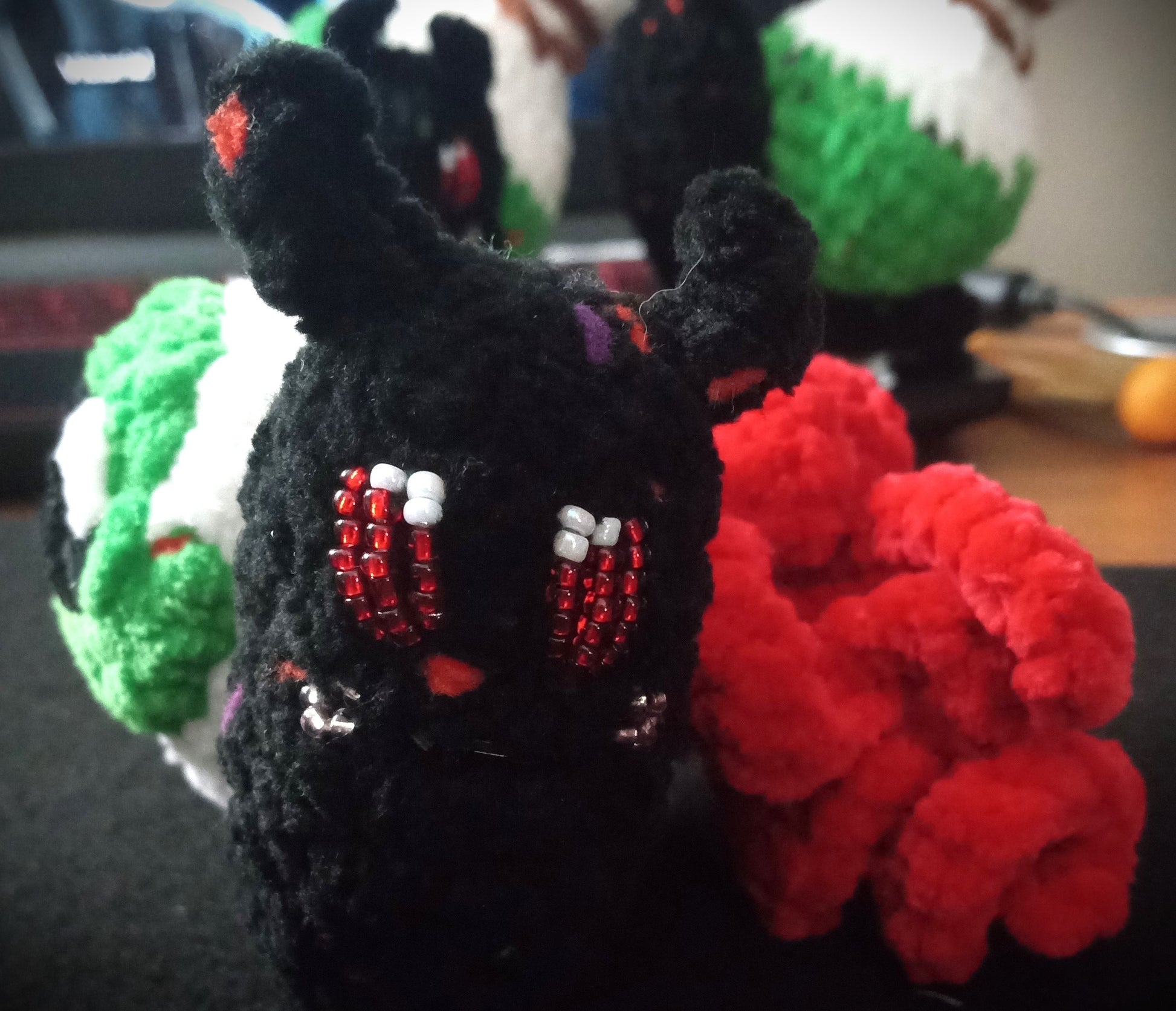 A palm sized snail familiar with an eyeball shell. Crocheted by me using the Eye-van the Eyeball Snail pattern by GardenHoeCrochet. They have a beaded face done by hand. The small beads make this unsuitable for small children and pets. 5+ years old. Adult supervision recommended.