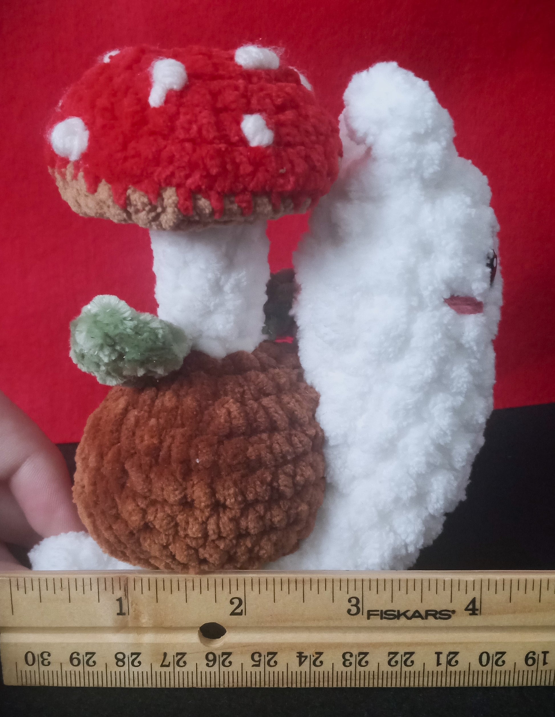 A palm sized snail friend with a lil mushroom ecosystem shell. Crocheted by me using the Shroombert the Mushroom Snail pattern by GardenHoeCrochet. They have safety eyes making them unsuitable for small children and pets. 5+ years old. Adult supervision recommended.